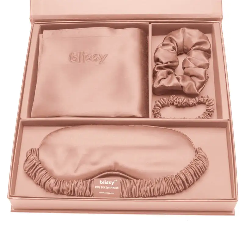 The ultimate beauty sleep set which includes the world’s best silk pillowcase, sleep mask, scrunchie and skinny scrunchie! Blissy silk products are handmade and crafted from high quality 22-Momme 100% Pure Mulberry Silk. We have spent countless hours prototyping, testing and using our products to ensure the highest quality and durability.