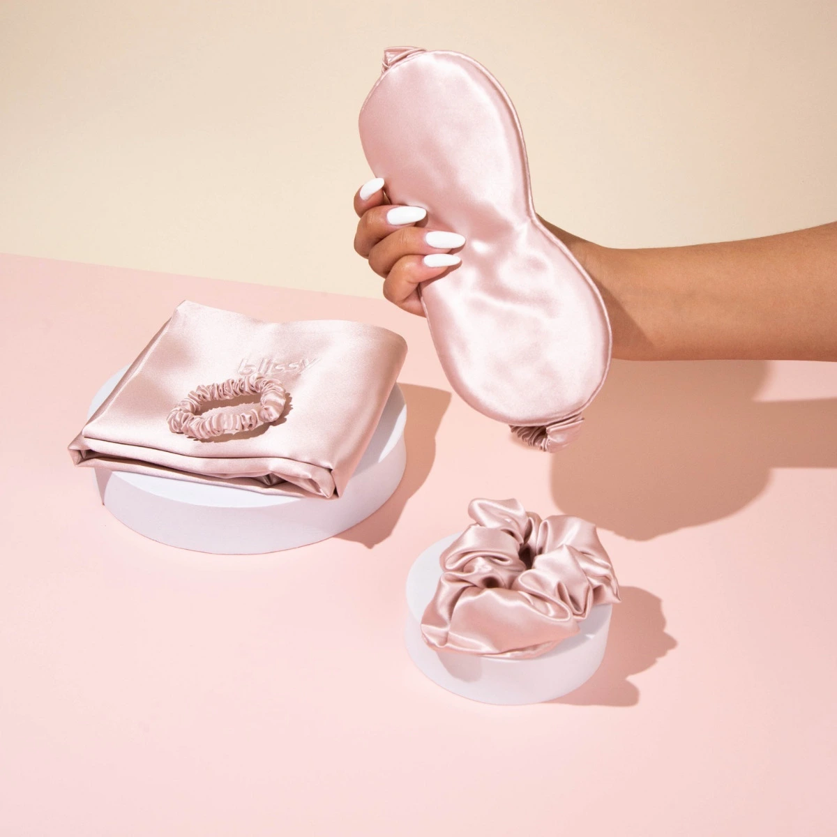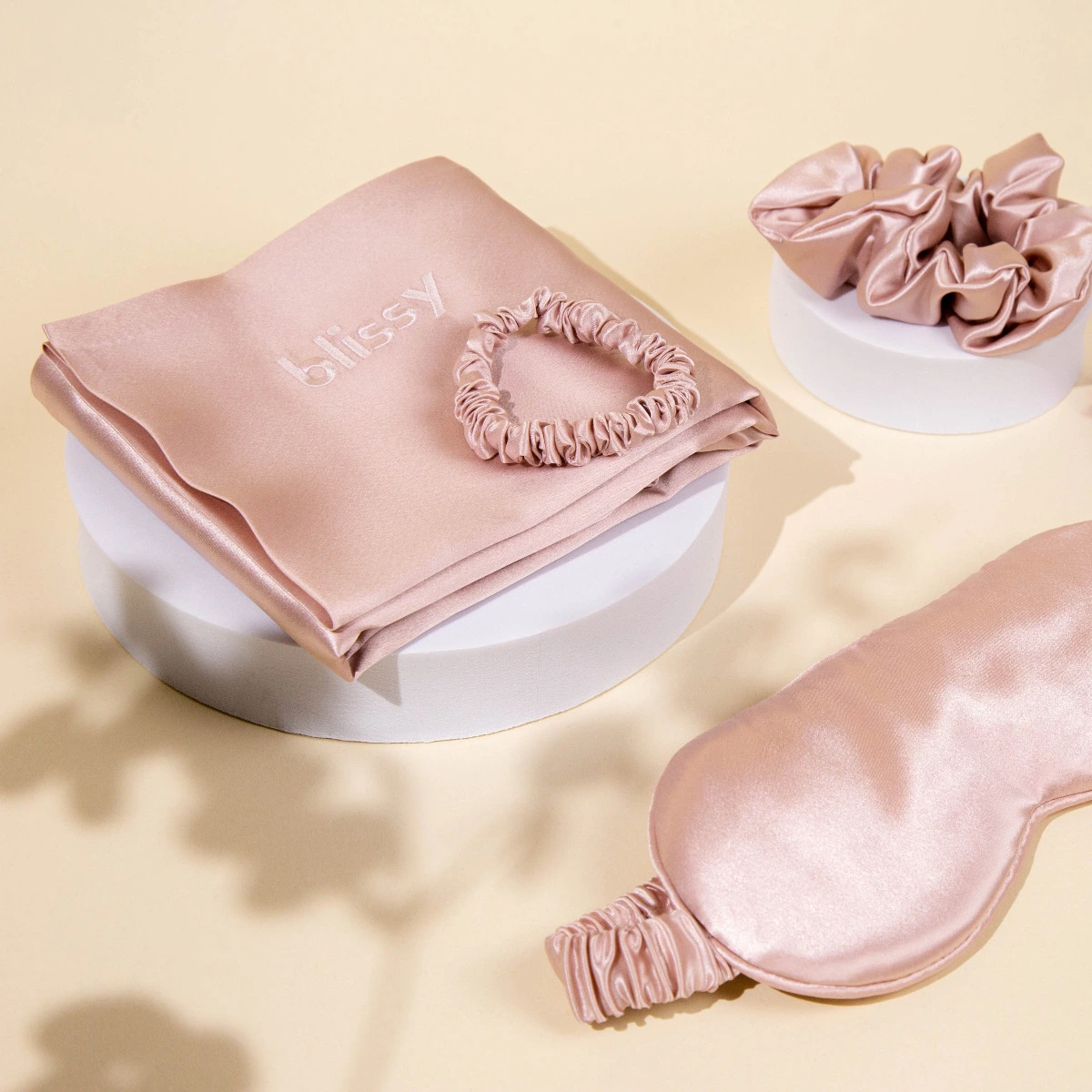 A 100% Natural Mulberry Silk four-piece beauty sleep set that does wonders for your hair, skin, and overall health while you sleep. Handcrafted from hypoallergenic pure Mulberry silk, Blissy silk essentials smooth hair & help prevent wrinkles by retaining moisture and aid in easing acne due to natural antibacterial properties. Blissy products are also cool to the touch & temperature regulating.