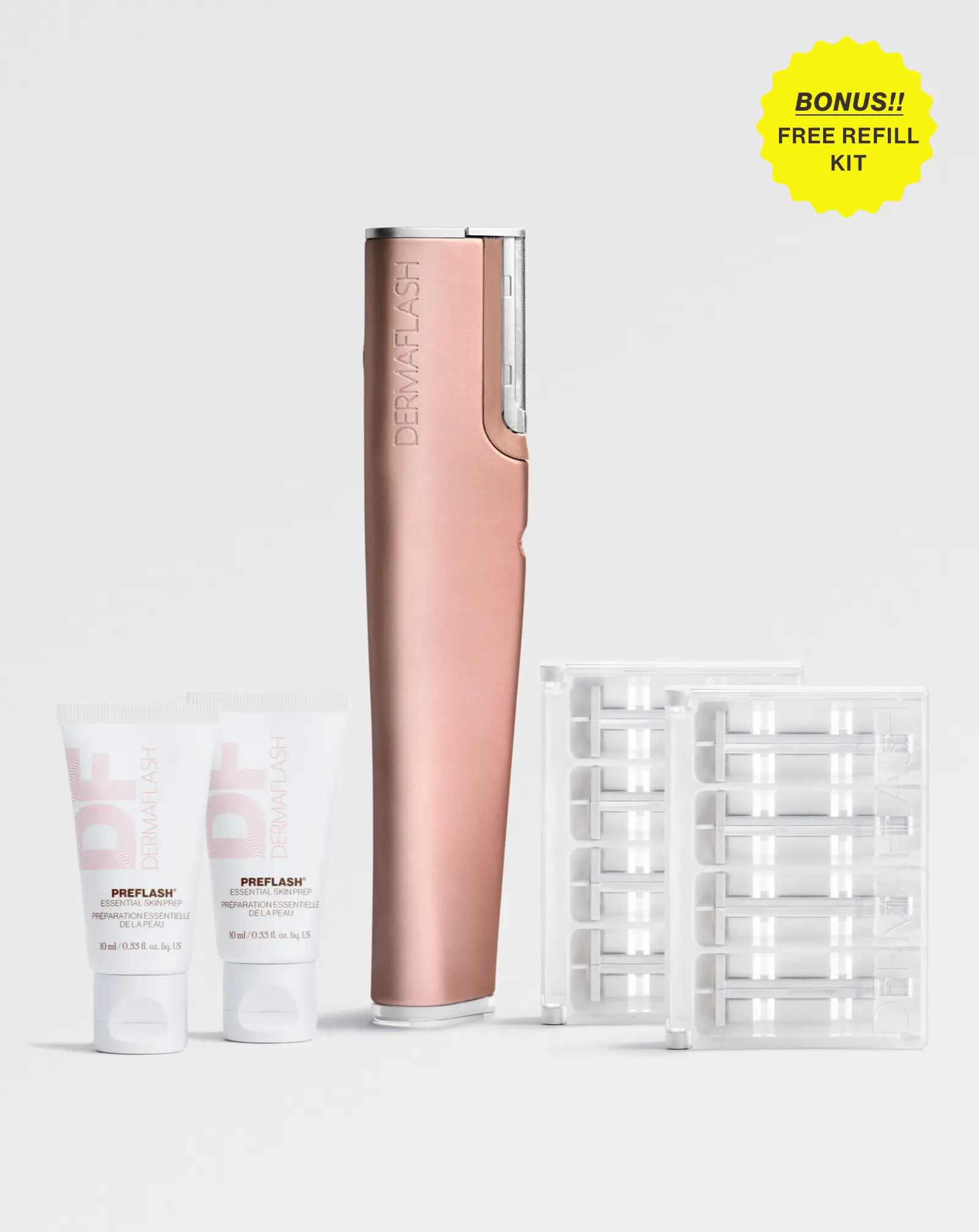 Meet NEW Rose Gold, a timeless shade with a custom-created, premium pearlescent satin finish and a luxurious soft touch feel. Your holiday gift set includes a bonus FREE Refill Kit with an extra 4-pack of Microfine Edges™ and additional PREFLASH® Cleanser. Enough for 2 months of weekly Flashes!