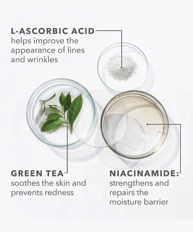 Water/Aqua/Eau, Glycerin, Pentylene Glycol, Ascorbic Acid, Camellia Sinensis (Green Tea) Leaf Extract, Camellia Sinensis (White Tea) Leaf Extract, Niacinamide, Superoxide Dismutase, Ubiquinone, Ascophyllum Nodosum Extract, Lactic Acid, Adenosine, Xanthan Gum, Sodium Hydroxide, Polysorbate 20, Citric Acid, Tetrasodium Glutamate Diacetate, Citrus Limon (Lemon) Fruit Extract, Sodium Benzoate, Potassium Sorbate