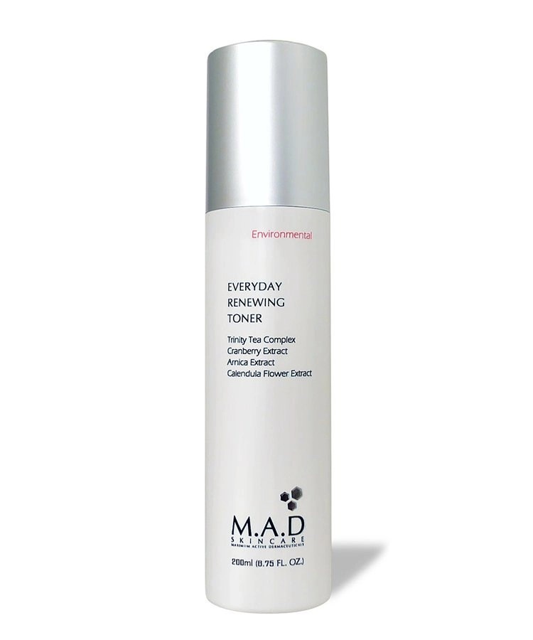 This innovative non-drying toner works to balance, nourish and quench the skin. You’ll feel the difference immediately upon applying Everyday Renewing Toner. This gentle, soothing toner has been infused with sodium hyaluronate to preserve skin’s moisture and has been packed with tons of antioxidants designed to maintain skin’s optimal look. This multi faceted toner has also been designed to optimize skin for treatments allowing for delivery of best possible results. Multi fruit acids have been added for effective but gentle exfoliation. M.A.D’s powerful trinity tea tree complex has been added to fight free radicals, and arnicia helps to reduce skin’s irritation. Calendula helps to soothe and heal sensitive skin and Amino Acid Rich complex provides natural UVA protection and accelerate repair of cells. This product is alcohol and paraben fee and does not contain and chemical colorants.
