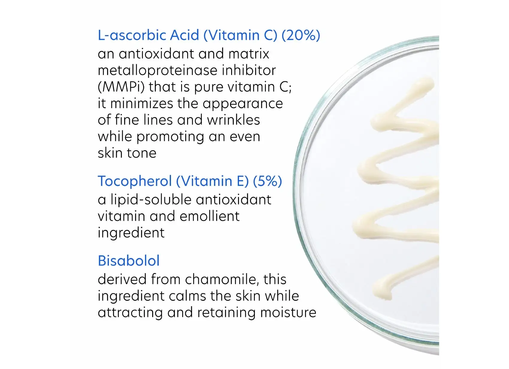 - Vitamin C an antioxidant that minimizes the appearance of fine lines and wrinkles while promoting an even skin tone.