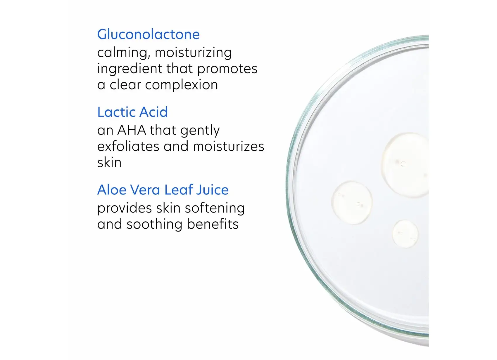- Gluconolactone a gentle antioxidant that is calming, provides moisture and promotes a clear complexion.