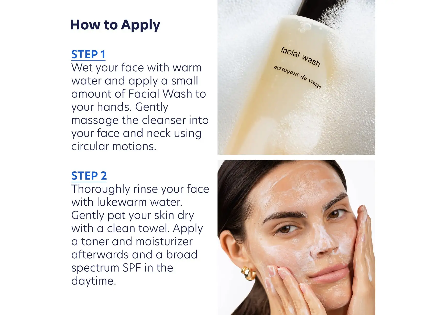 Apply a dime-sized amount to damp skin and massage into a light foaming lather. Rinse with warm water and pat dry. Follow with the appropriate PCA SKIN corrective products and broad spectrum SPF product in the daytime, and moisturizer in the evening.