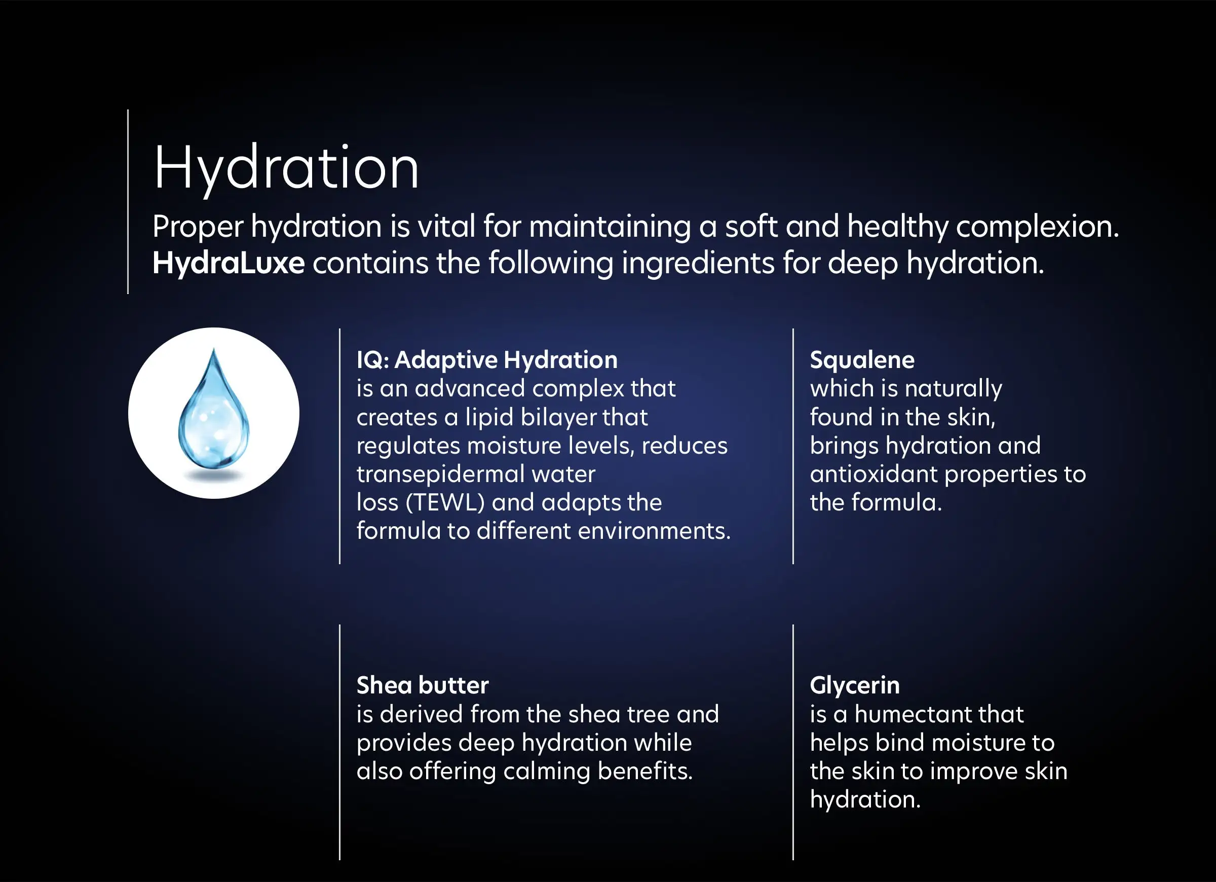 - IQ: Adaptive Hydration n advanced complex that regulates moisture levels in the skin, reduces water loss and adapts the formula to different environments.