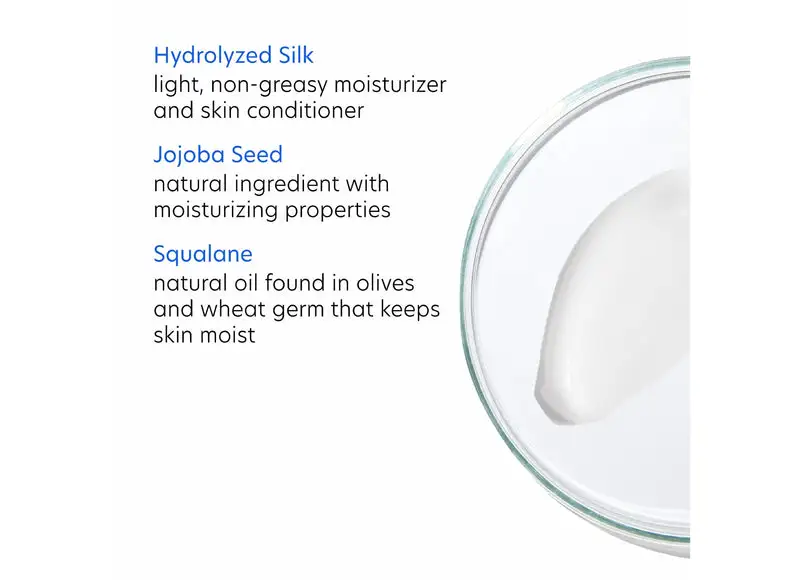 - Hydrolyzed silk a light, non-greasy moisturizer and skin conditioner.