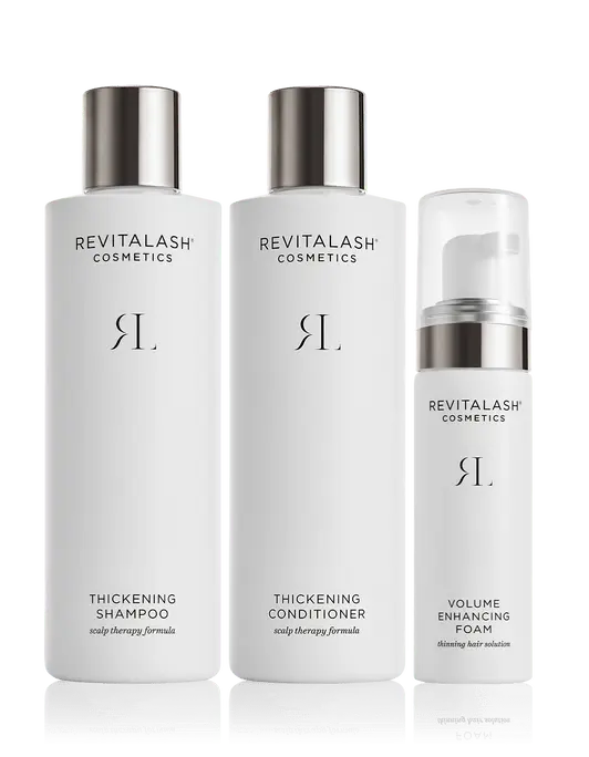 A breakthrough, unisex hair regimen designed to be used in tandem to address the needs of fine and thinning hair. Our thickening scalp therapy shampoo and conditioner optimize scalp health by nourishing, hydrating, and adding shine and body. Coupled with the hair volume enhancer delivering RevitaLash Science to the hair, hair transforms for thicker-looking and fuller-bodied locks you’ll love.