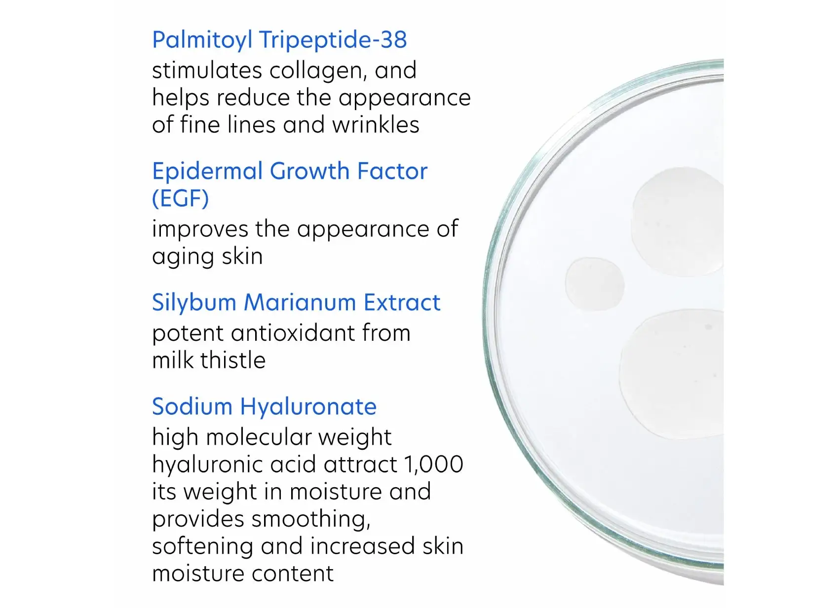 This next generation peptide and epidermal growth factor formulation minimizes the appearance of fine lines, wrinkles and pores while firming, tightening and strengthening aging skin.
