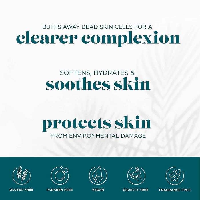 - Buffs away dead skin cells, calms inflammation, and soothes redness for a clearer complexion.
