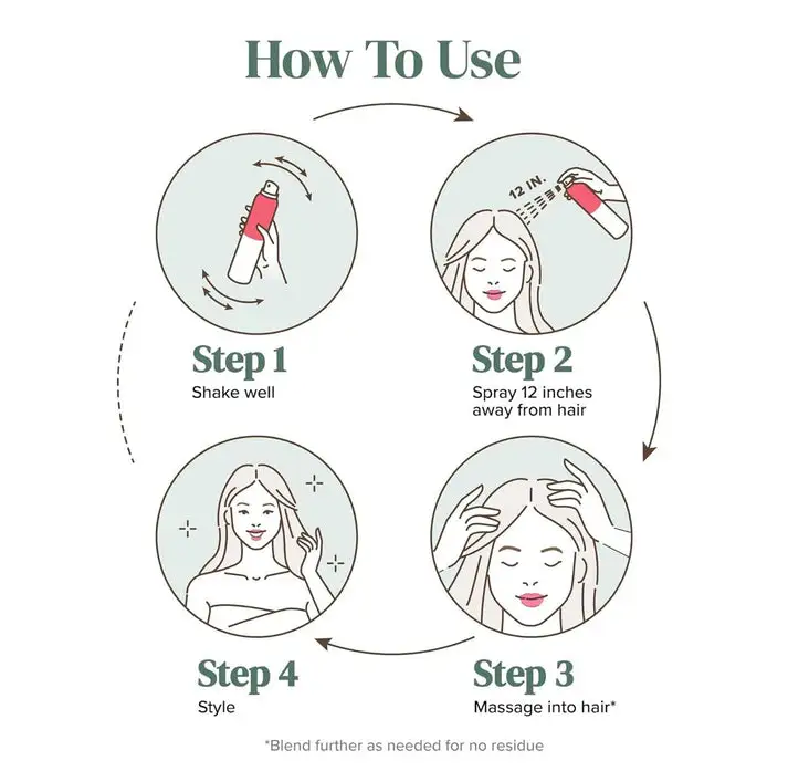 - Shake well, hold can 12in/30cm away from hair, and spray. Massage well and brush throughout to refresh hair.
