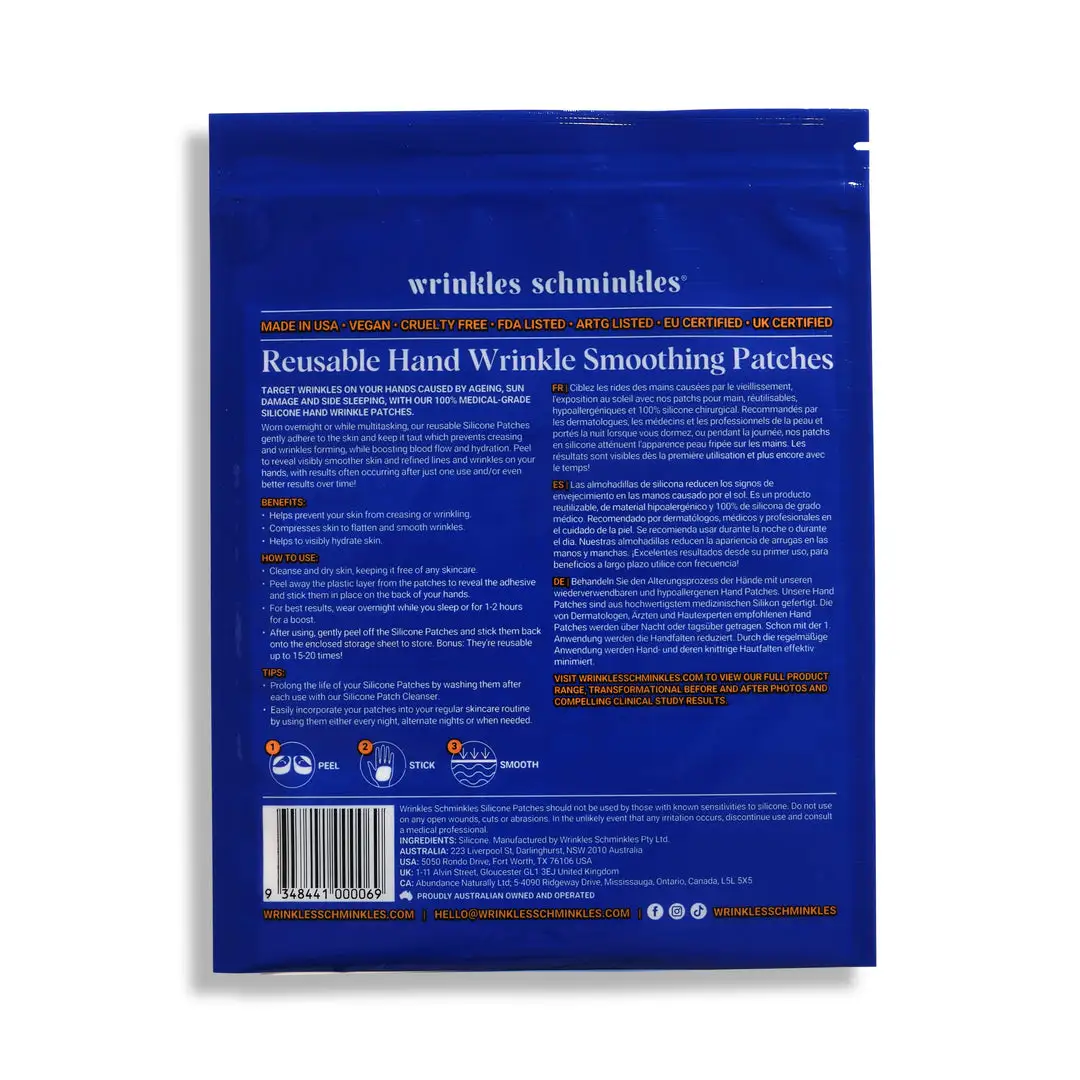 Ideally worn overnight while you sleep (and when skin clicks into repair mode) or as a quick boost for 1-2 hours, our skin-safe, reusable Hand Wrinkle Patches work by forming an occlusive layer over the skin that pulls it taught and prevents it from creasing or wrinkling, while simultaneously hydrating the skin, increasing circulation and overall skin resilience.